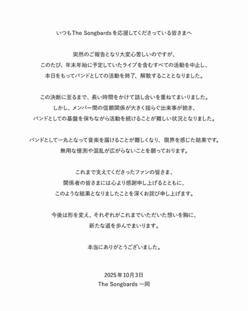 The Songbardsは2025年10月3日に解散を発表しました。公式発表によると、メンバー間の信頼関係が回復せず、話し合いの末に解散という結論に至ったとのことです。
